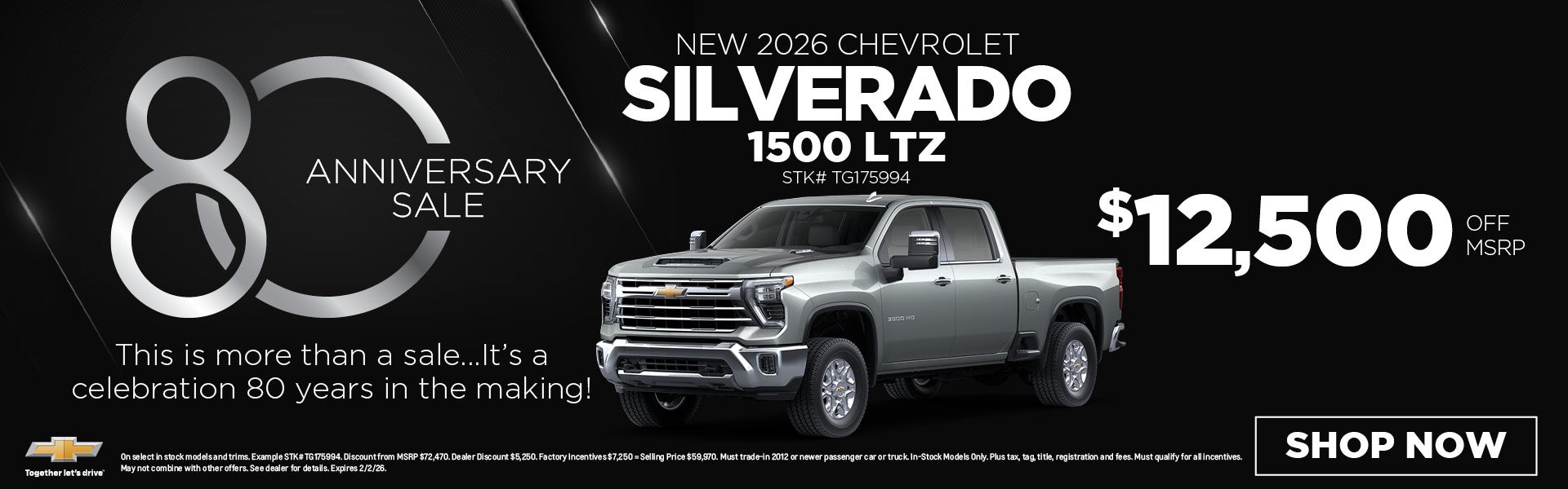 On select in stock models and trims. Example STK# TG175994. Discount from MSRP $72,470. Dealer Discount $5,250. Factory Incentives $7,250 = Selling Price $59,970. Must trade-in 2012 or newer passenger car or truck. In-Stock Models Only. Plus tax, tag, title, registration and fees. Must qualify for all incentives. May not combine with other offers. See dealer for details. Expires 2/2/26.